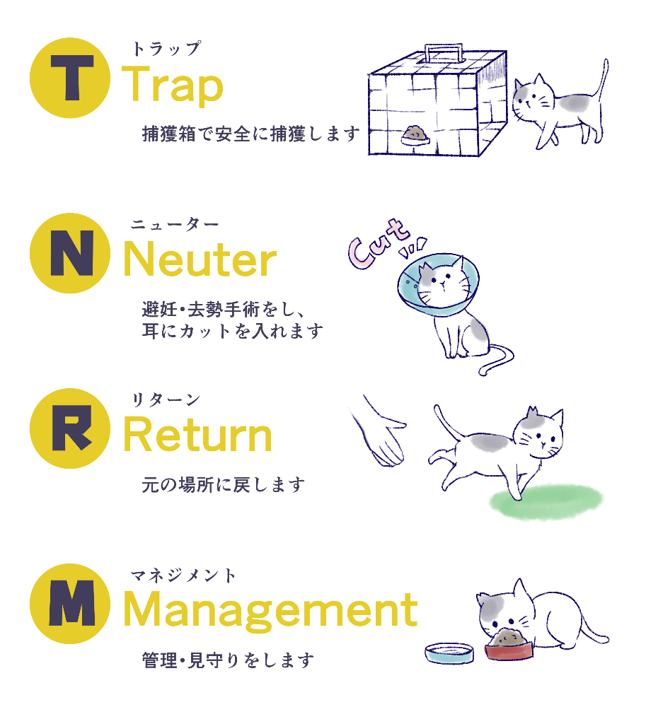地域住民やボランティアが行う「地域猫活動」の具体的な手法です。